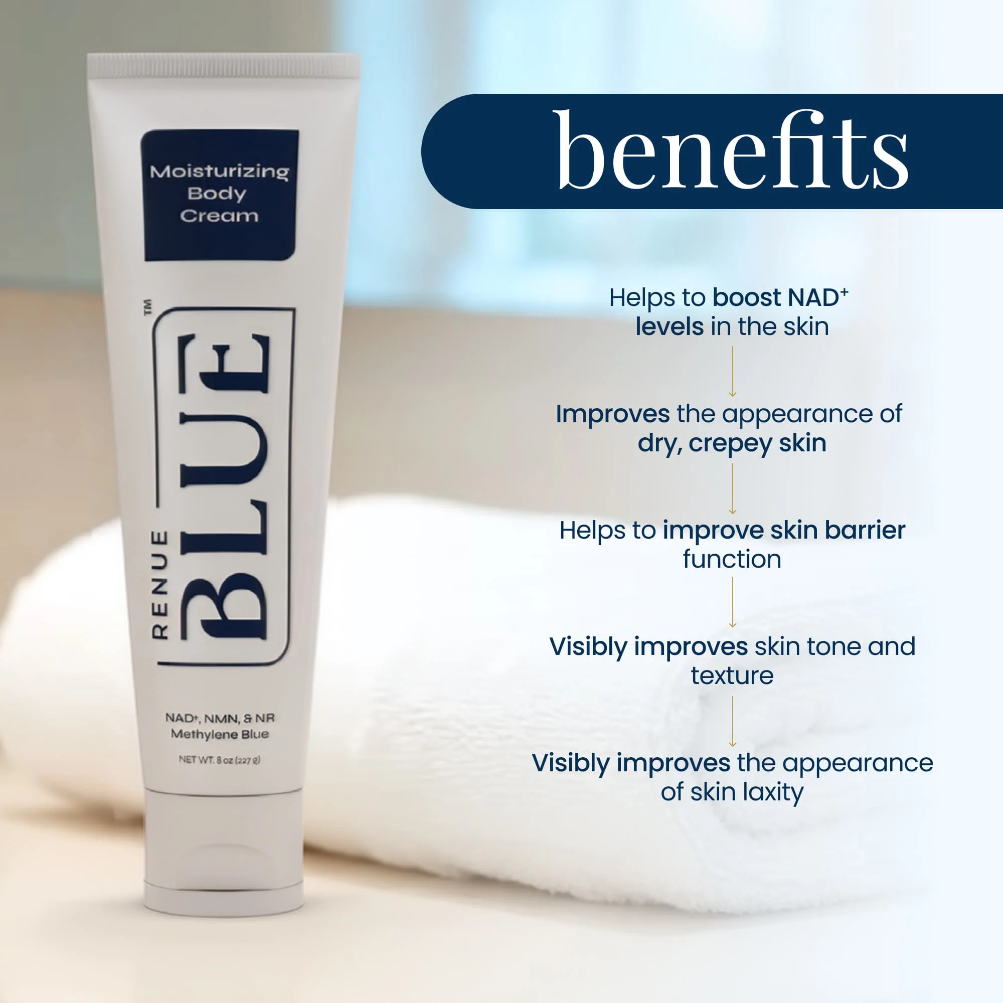 The Moisturizing Body Cream is expertly formulated for the specific needs of the skin on your body with our powerful NAD+ Complex, liposomal delivery technology, and a blend of antioxidants to support hydration, help to restore elasticity, and combat visible signs of skin aging. Enriched with squalene, nourishing botanical extracts, methylene blue, CoQ10, and peptides, this deeply nourishing body cream helps to support your skin at the cellular level for the appearance of healthier-looking skin.
