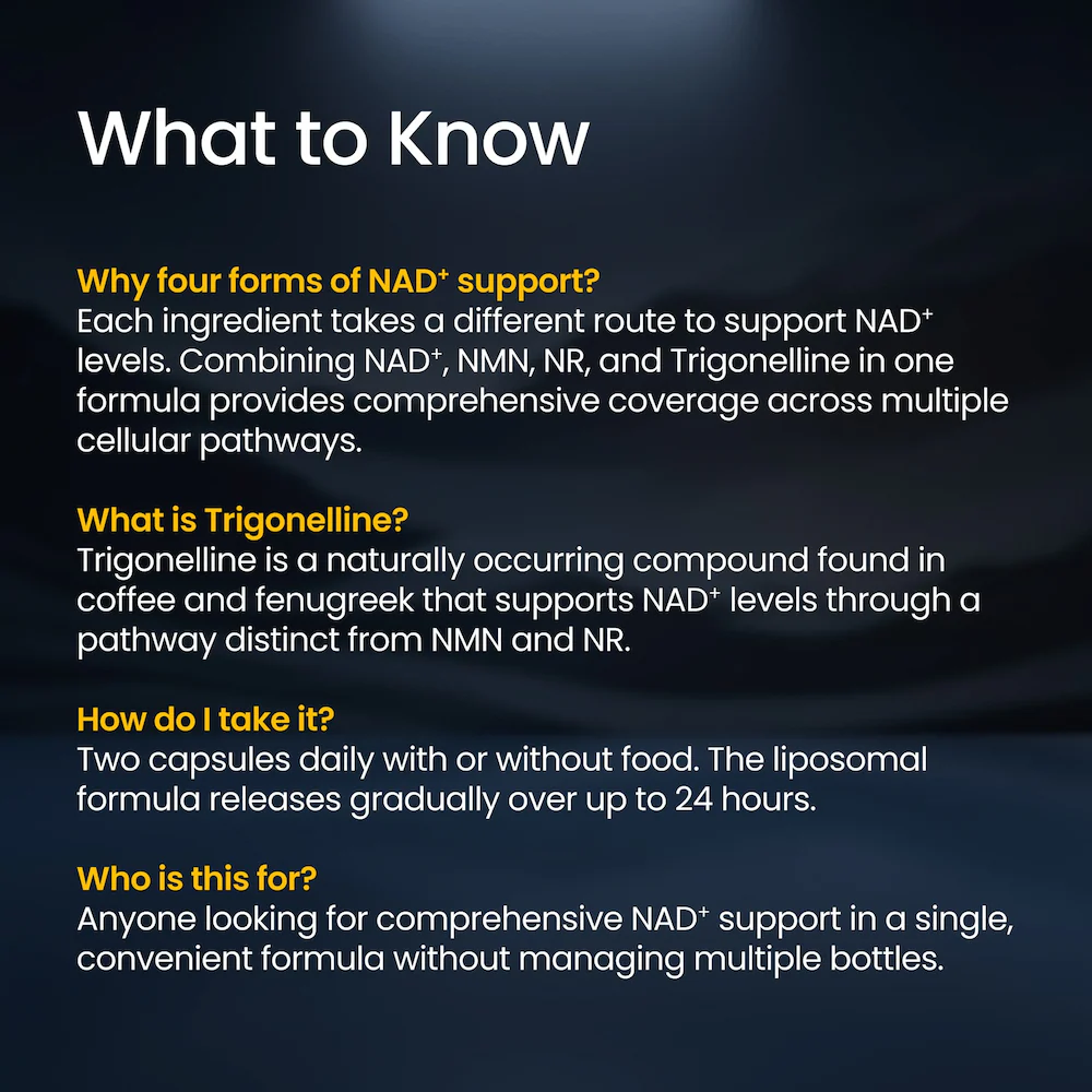 LIPO NAD⁺ Complete is a powerful 4-in-1 NAD⁺ booster, featuring our proprietary powder-based liposomes that protect NAD⁺, NMN, NR, & Trigonelline from digestive enzymes and carry them into the bloodstream for targeted systemic delivery.